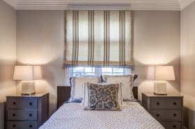 Минимализм в длине и декоре. Многоуровневые, объемные комбинации уменьшат пространство, которого и так не много. Лаконичные римские шторы до подоконника станут отличным решением для маленькой спальни.