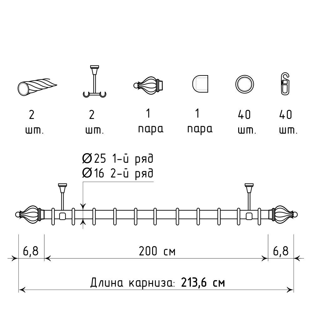 Длина карниза указана без учета размера наконечников. Следует учитывать, что наконечник «Аладдин» добавит по 6,8 см с каждой стороны.