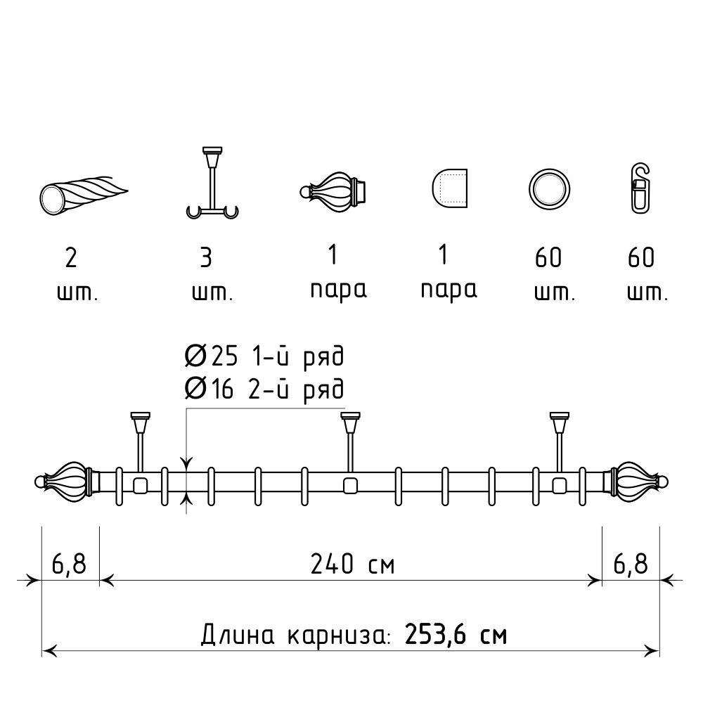 Длина карниза указана без учета размера наконечников. Следует учитывать, что наконечник «Аладдин» добавит по 6,8 см с каждой стороны.