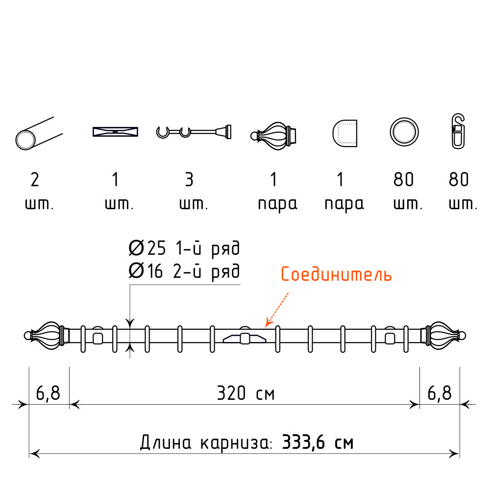 Длина карниза указана без учета размера наконечников. Следует учитывать, что наконечник «Аладдин» добавит к длине трубы по 6,8 см с каждой стороны.
