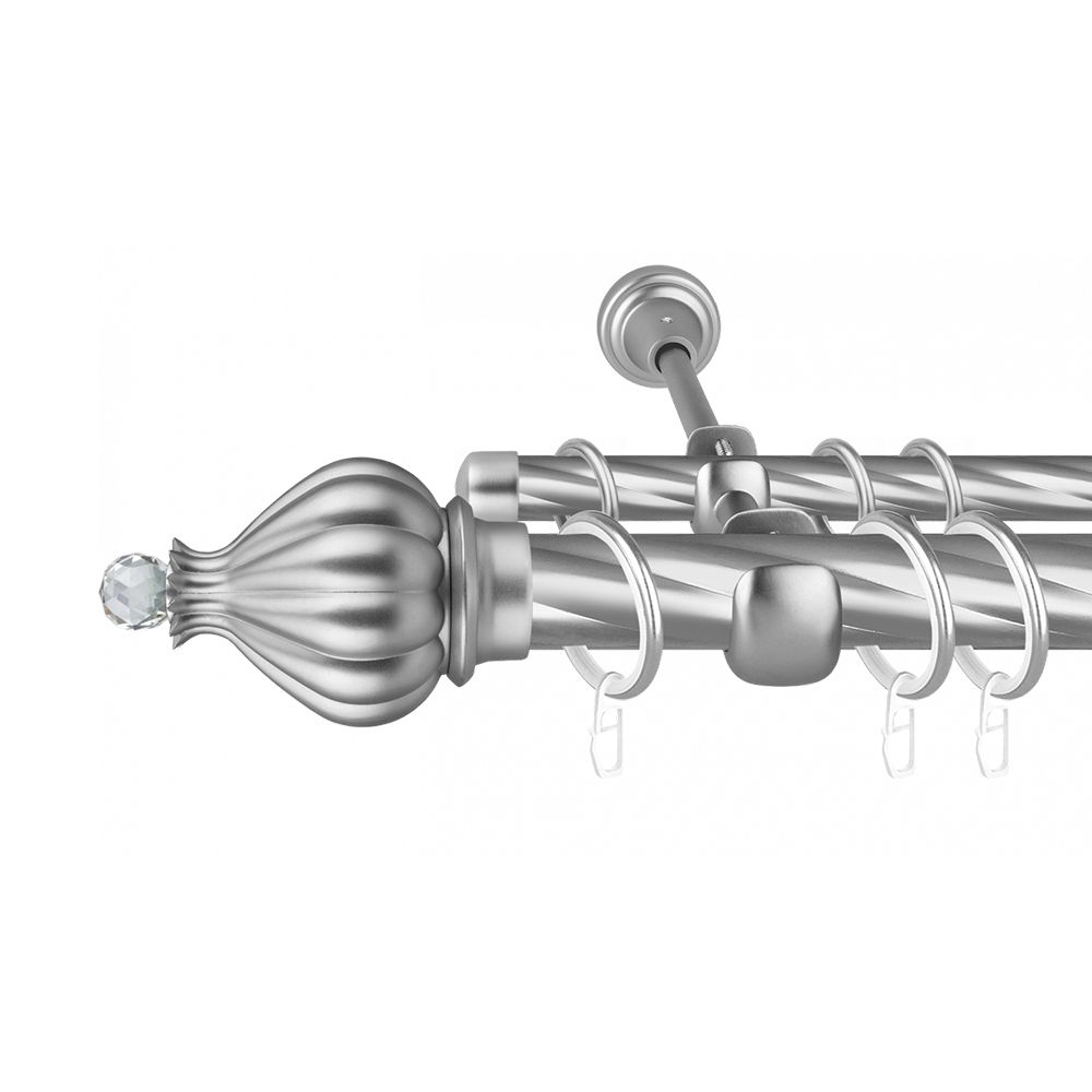 Двухрядный стеновой карниз «Аладдин» - не выходящая из моды классика, отлично подойдет для истинных ценителей красоты. Карниз прекрасно впишется в интерьер комнаты и будет привлекать внимание ко всему оконному декору. На нем можно разместить два вида текстиля, в большинстве случаев это основная штора и тюль.