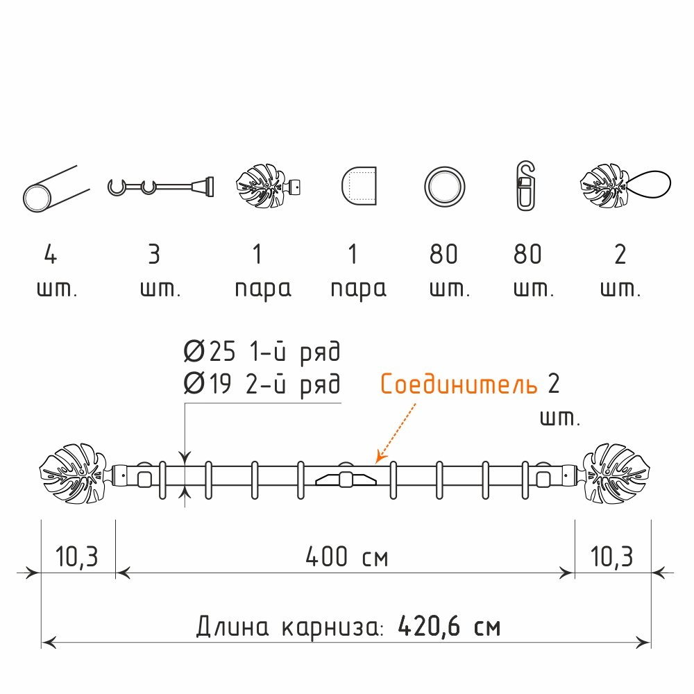 Длина карниза указана без учета размера наконечников. Следует учитывать, что наконечники «Монстера» добавят по 10,3 см с каждой стороны.