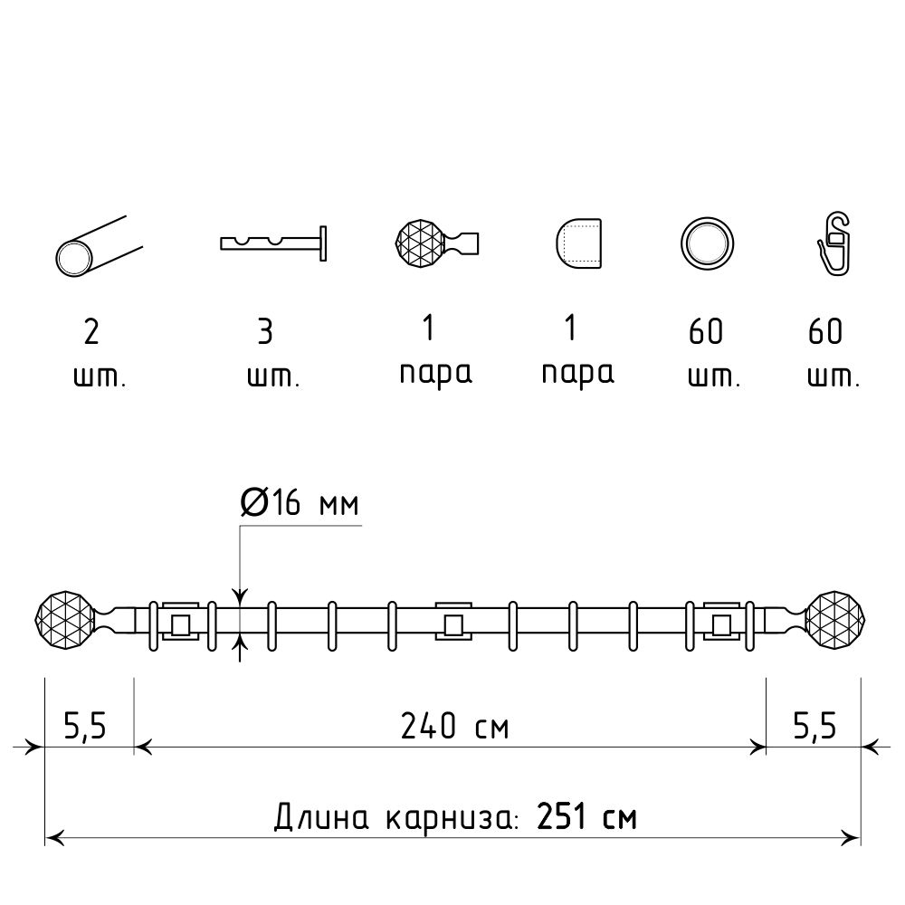 Длина карниза указана без учета размера наконечников. Следует учитывать, что наконечник «Морано» добавит к длине трубы по 5,5 см с каждой стороны.