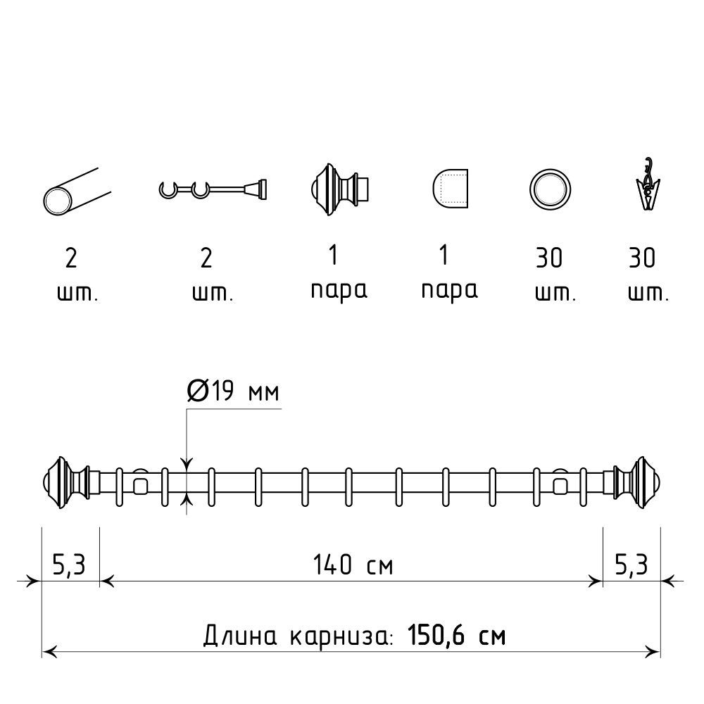 Длина карниза указана без учета размера наконечников. Следует учитывать, что наконечник «Верди» добавит к общей длине карниза по 5,3 см с каждой стороны. По индивидуальному запросу длину трубы можно отрегулировать, достаточно оставить об этом комментарий и указать необходимый размер трубы.