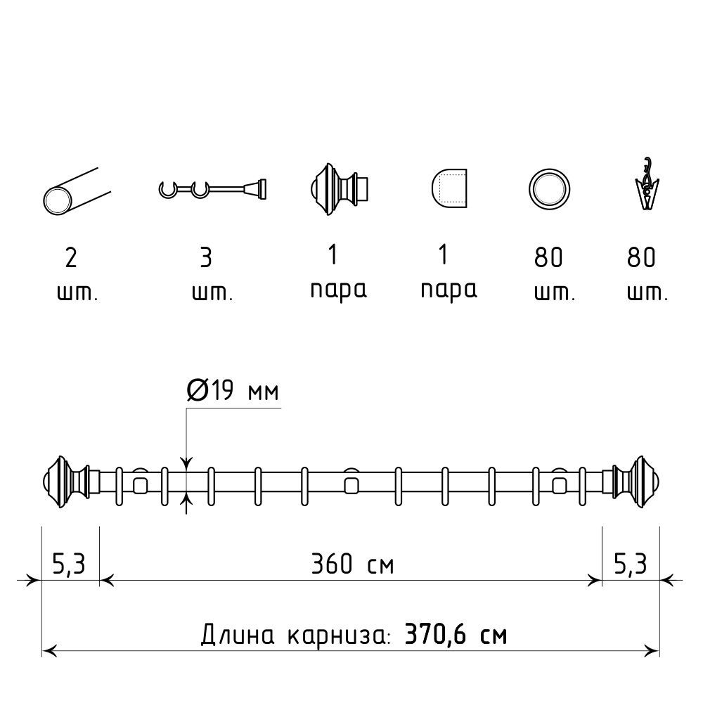 Длина карниза указана без учета размера наконечников. Следует учитывать, что наконечник «Верди» добавит к общей длине карниза по 5,3 см с каждой стороны. По индивидуальному запросу длину трубы можно отрегулировать, достаточно оставить об этом комментарий и указать необходимый размер трубы.