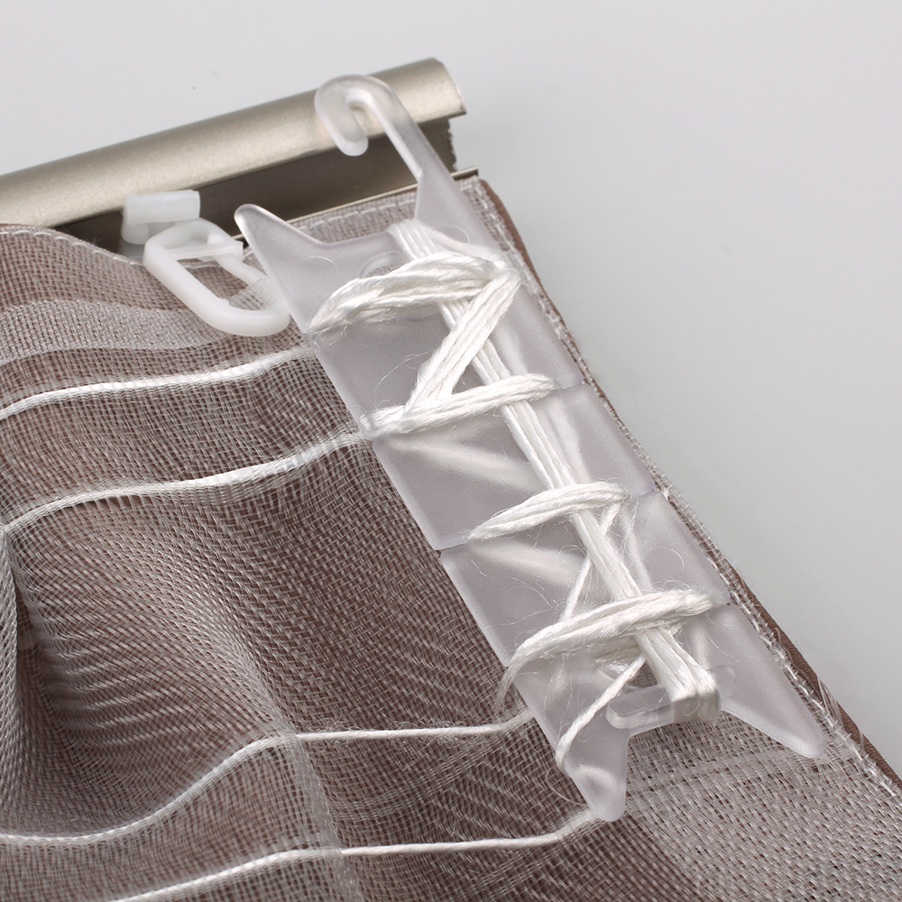 Фиксатор решает эту проблему и обеспечивает натяжение шнуров шторной тесьмы, сохраняя драпировочный рисунок. Изделие располагается с тыльной стороны портьеры и на него наматываются корды. Таким образом можно регулировать силу натяжения отдельных шнуров.
