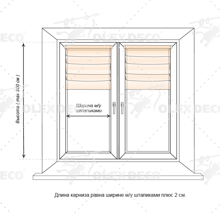 Для заказа нужного размера карниза вам необходимо необходимо измерить ширину между штапиками створки окна как показано на приведенной ниже схеме №2. Высота ограничена максимально допустимой высотой ткани: 3 метра.