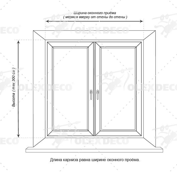 Для заказа нужного размера карниза вам необходимо измерить высоту и полную ширину (в верхней части оконного проёма), как показано на приведенной ниже схеме №1.