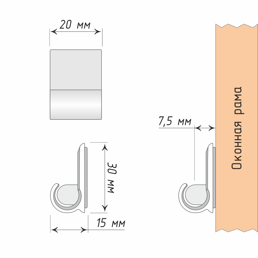 Мини-карниз представляет собой простое устройство для небольших легких занавесок и крепится на каждую створку окна с помощью двустороннего скотча. Кронштейн выполняет одновременно функцию наконечника и представляет собой единую конструкцию. Каждый из пары кронштейнов имеет заглушки по бокам и различается на правый и левый. |