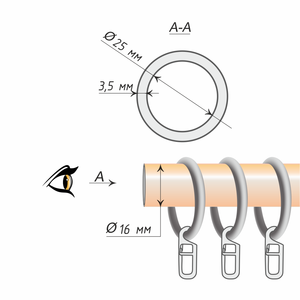 Данное кольцо является традиционным аксессуаром кованого карниза и предназначено для труб диаметром 16 мм. В комплект входит шторный крючок, с помощью которого портьерная ткань соединяется с карнизом. Кольцо и крючок обеспечивают оптимальное размещение и сдвижение полотна шторы.