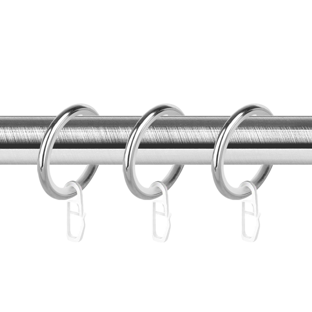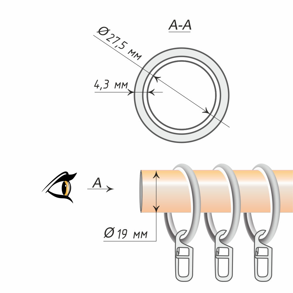 Представленная модель кольца, предназначенного для металлической трубы диаметром 19 мм, снабжена пластиковой вставкой и крючком. Такой набор элементов делает максимально простым и удобным подвешивание штор к кованому карнизу. Вставка препятствует возникновению на штанге повреждений и позволяет бесшумно отвешивать или завешивать штору. Крючки обеспечивают надёжное соединение занавески и карниза. Они будут незаметными на оконной композиции, если ткань портьеры снабжена специальной шторной лентой.