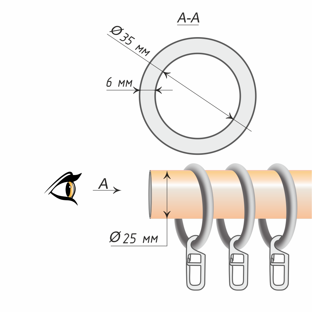 Данное кольцо является традиционным аксессуаром кованого карниза и предназначено для труб диаметром 25 мм. В комплект входит шторный крючок, с помощью которого портьерная ткань соединяется с карнизом. Кольцо и крючок обеспечивают оптимальное размещение и сдвижение полотна шторы.