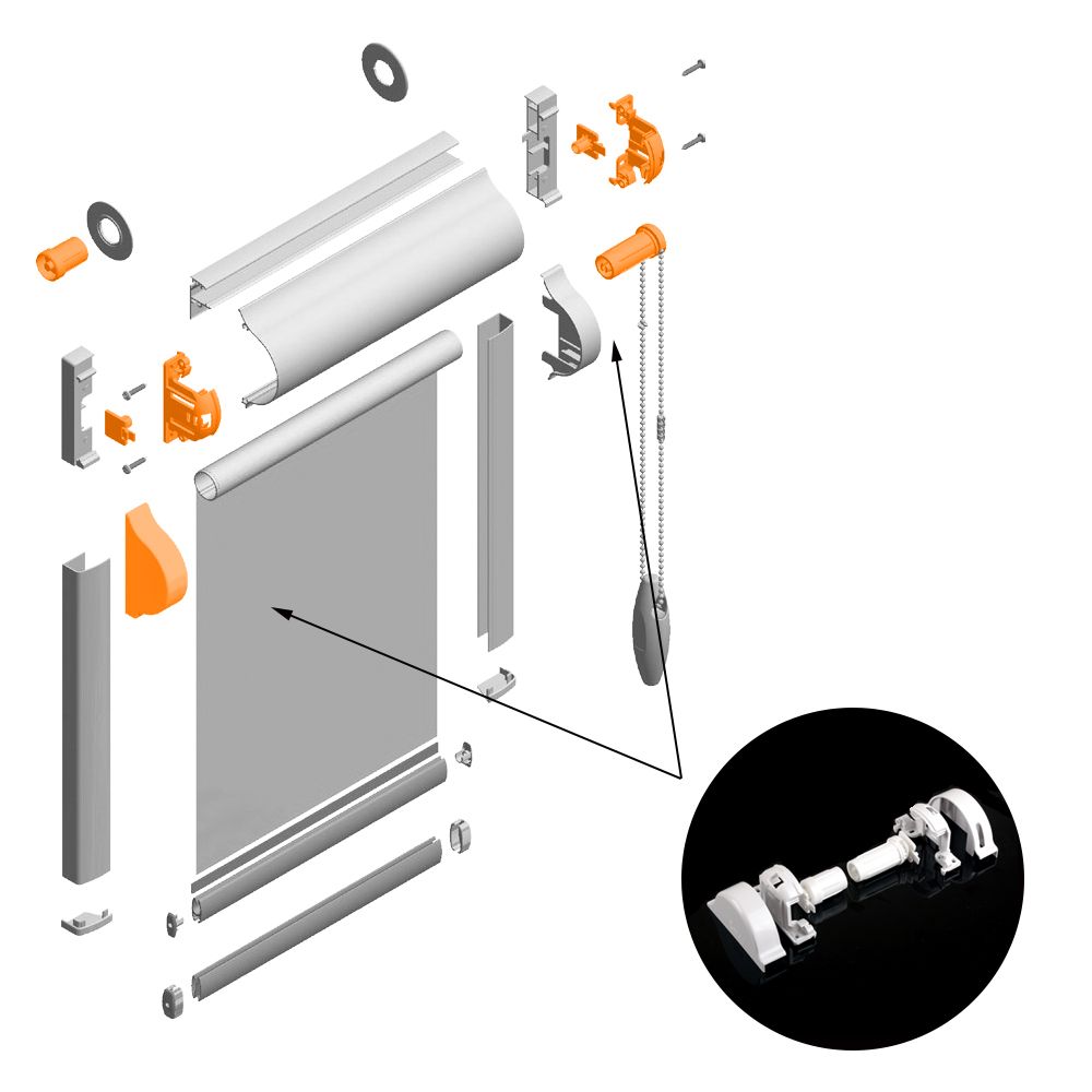 Цепь закрепляется в механизме через отверстие в левой защитной крышке для кассеты, закрывающей рулон. Следовательно, управление рулонной шторой будет осуществляться с левой стороны.