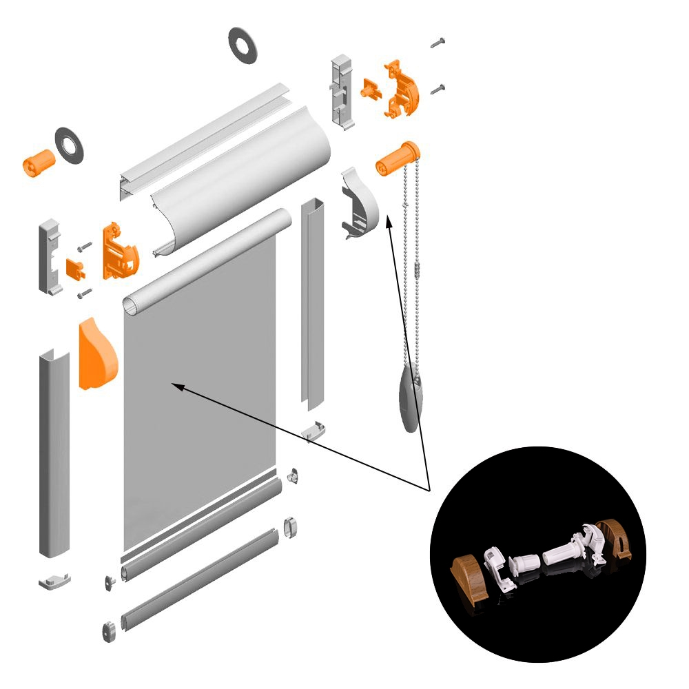 Цепь закрепляется в механизме через отверстие в левой защитной крышке для кассеты, закрывающей рулон. Следовательно, управление рулонной шторой будет осуществляться с левой стороны.