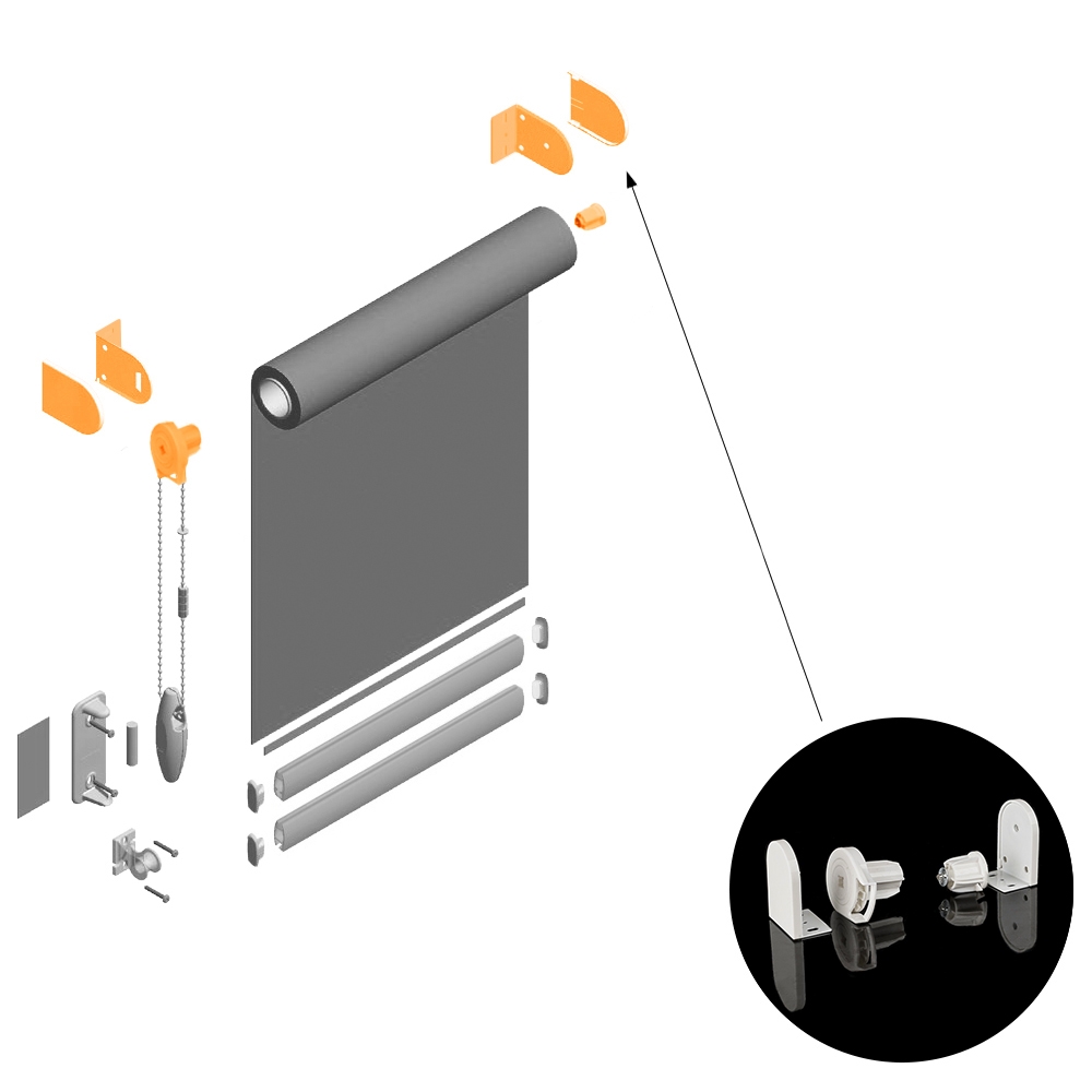 В комплект входят кронштейны, позволяющие крепить конструкцию рулонных штор на стену или потолок.