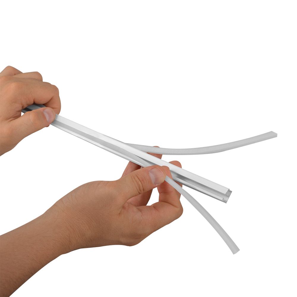 Изделие меньшего размера вставляется в паз для бегунков, изделие большего размера – в замочную полость. Повышенная пластичность синтетических вставок позволяет полностью сохранить рабочую конфигурацию профиля. Результат – полноценный карниз для штор, имеющий оригинальную форму.