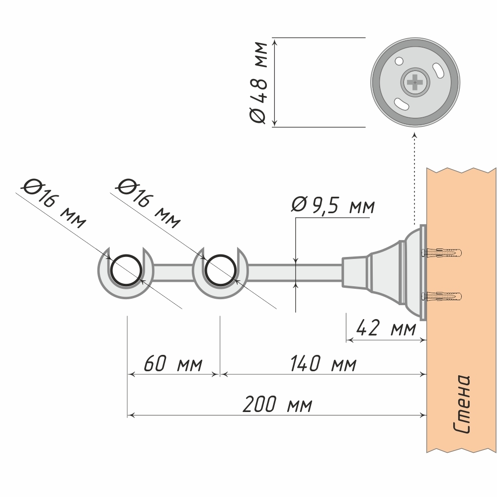 Дизайн кронштейна выполнен в традиционном стиле, что делает его универсальным выбором для любого интерьера. Расстояние между первым и вторым рядом составляет 60 мм. Благодаря этому, на первый ряд карниза можно повесить штору с люверсами или со шторной лентой «Имитация люверсов», портьера не будет касаться легкой тюля на втором ряду.