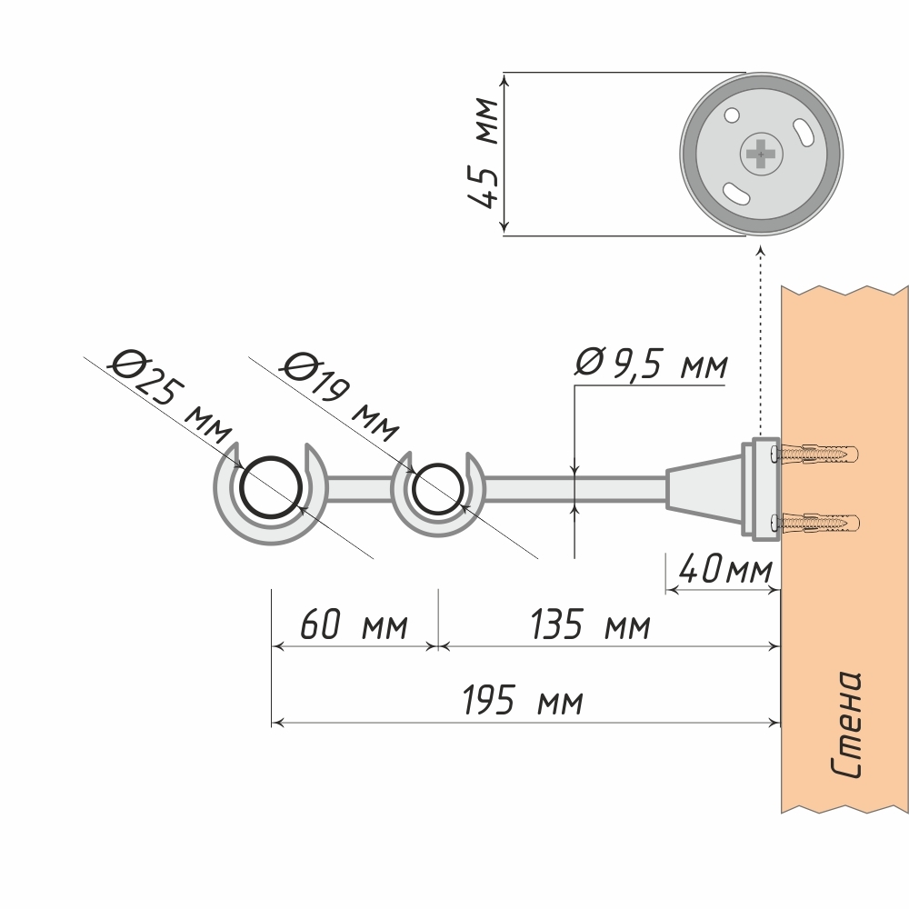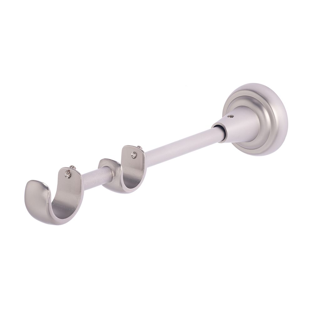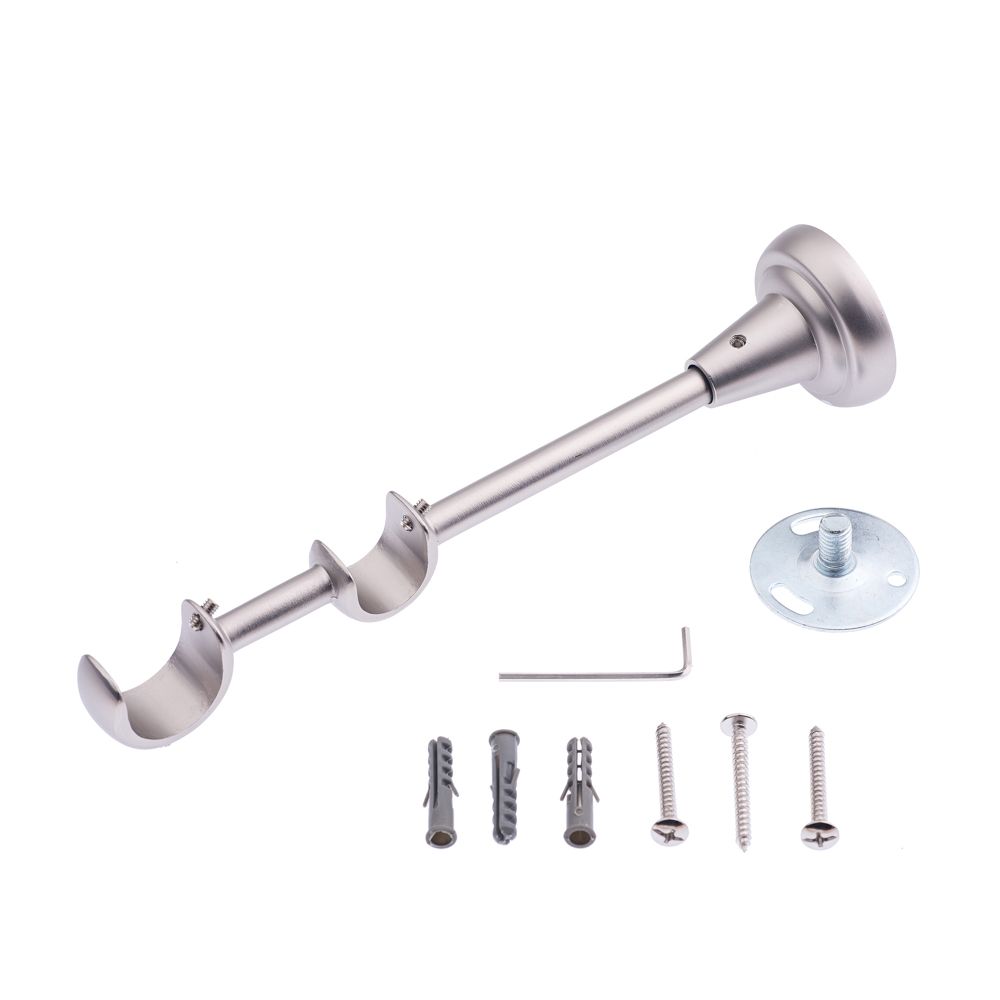 Кронштейн металлический двухрядный, предназначенный для размещения кованых труб диаметром 25 мм (ближний к наблюдателю ряд) и 19 мм (ближний к стене ряд). Простой и надёжный способ формирования классической оконной композиции с плотными шторами и тюлем.