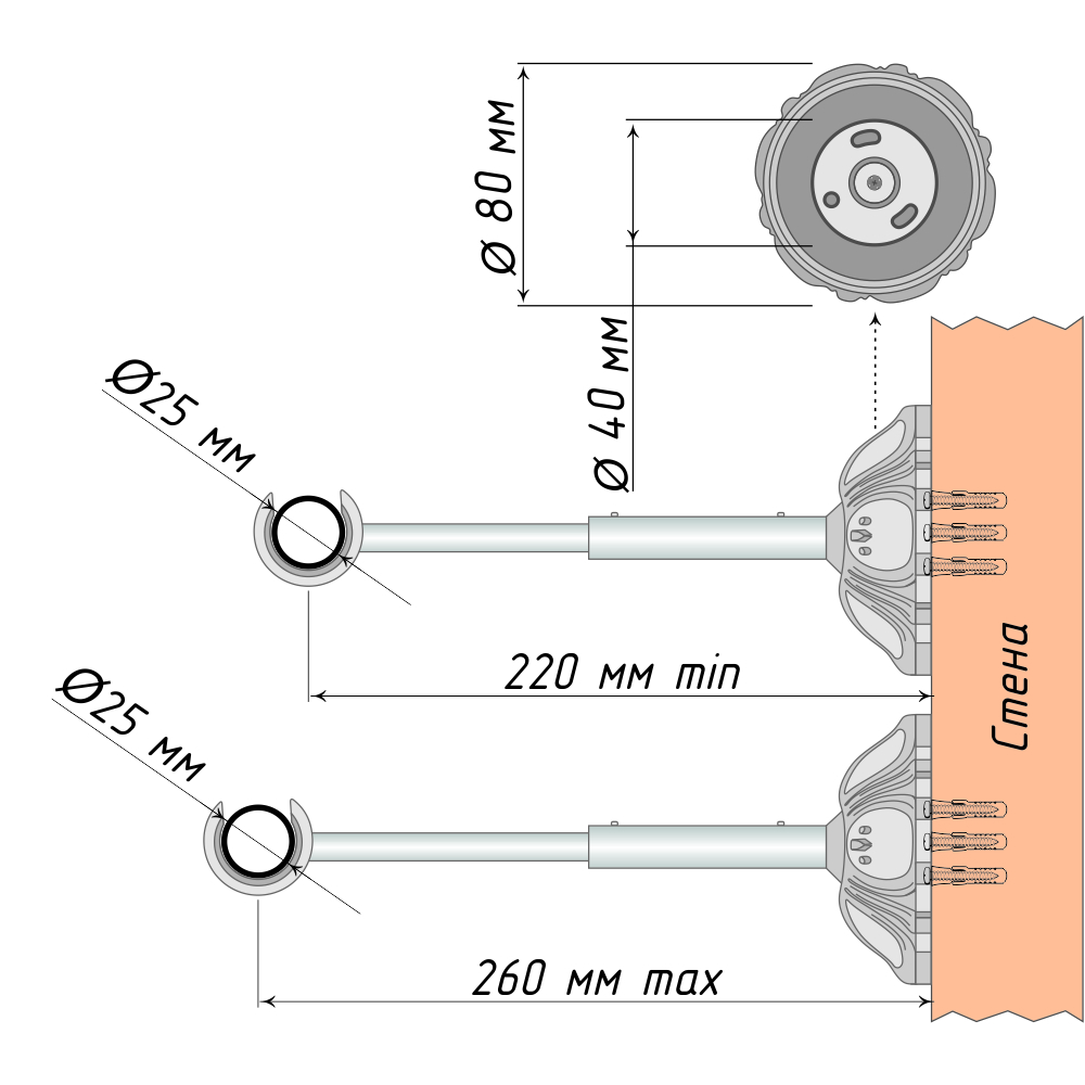 Однорядный держатель предназначен для настенного монтажа кованой трубы диаметром 25 мм. Изысканный дизайн основания кронштейна гармонично сочетается с практическими преимуществами изделия.