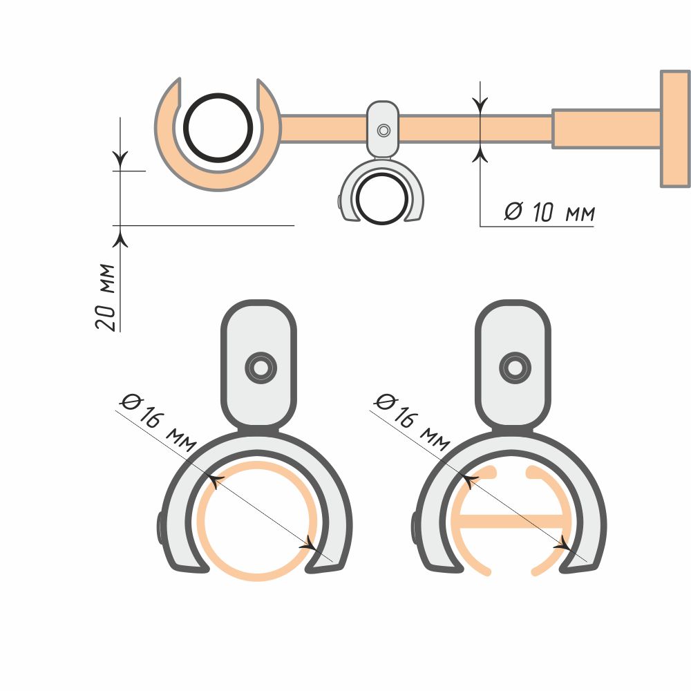 Через верхнее «ушко» изделие надевается на стержень настенного кронштейна. Надёжная фиксация обеспечивается посредством ключа-шестигранника, которым закручивается затяжной винт. Затем в полукруглый нижний держатель помещается карнизная труба, которая также зажимается с помощью шестигранного ключа.