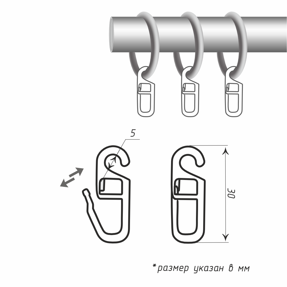 Изделие подходит для карнизных колец диаметром до 25 мм включительно, в том числе колец с пластиковой вставкой.