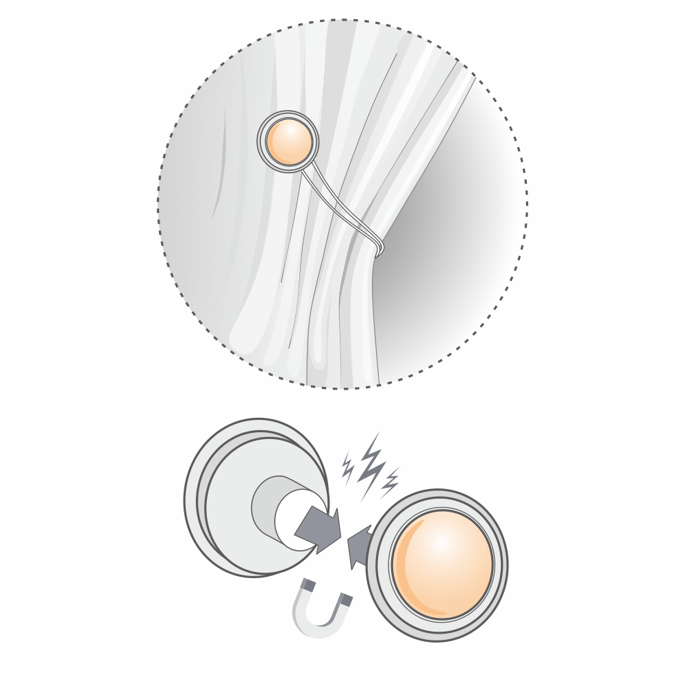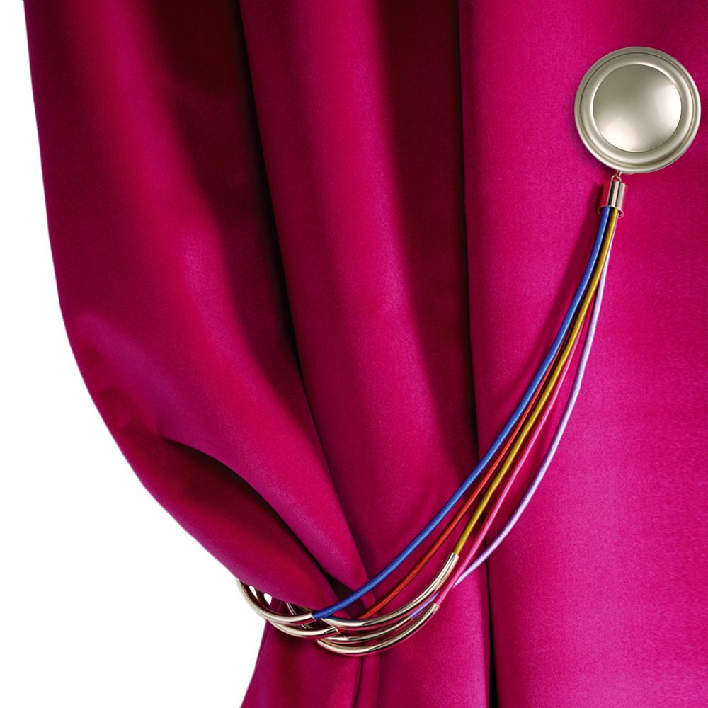Достаточно соединить между собой на портьере две половины магнита для кисти «Шато». Получается приспособление, к которому надёжно крепится шторный подвес, собирающий шторы в эстетичные драпировочные складки.