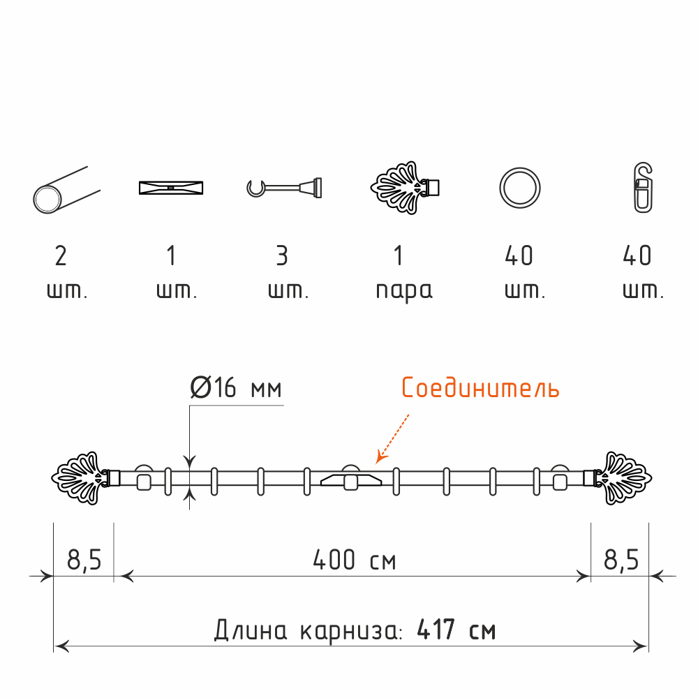Длина карниза указана без учета размера наконечников. Следует учитывать, что наконечник «Модель» добавит к длине карниза по 8,5 см с каждой стороны. По индивидуальному запросу можно отрегулировать длину карниза, достаточно оставить об этом комментарий и указать необходимый размер трубы.