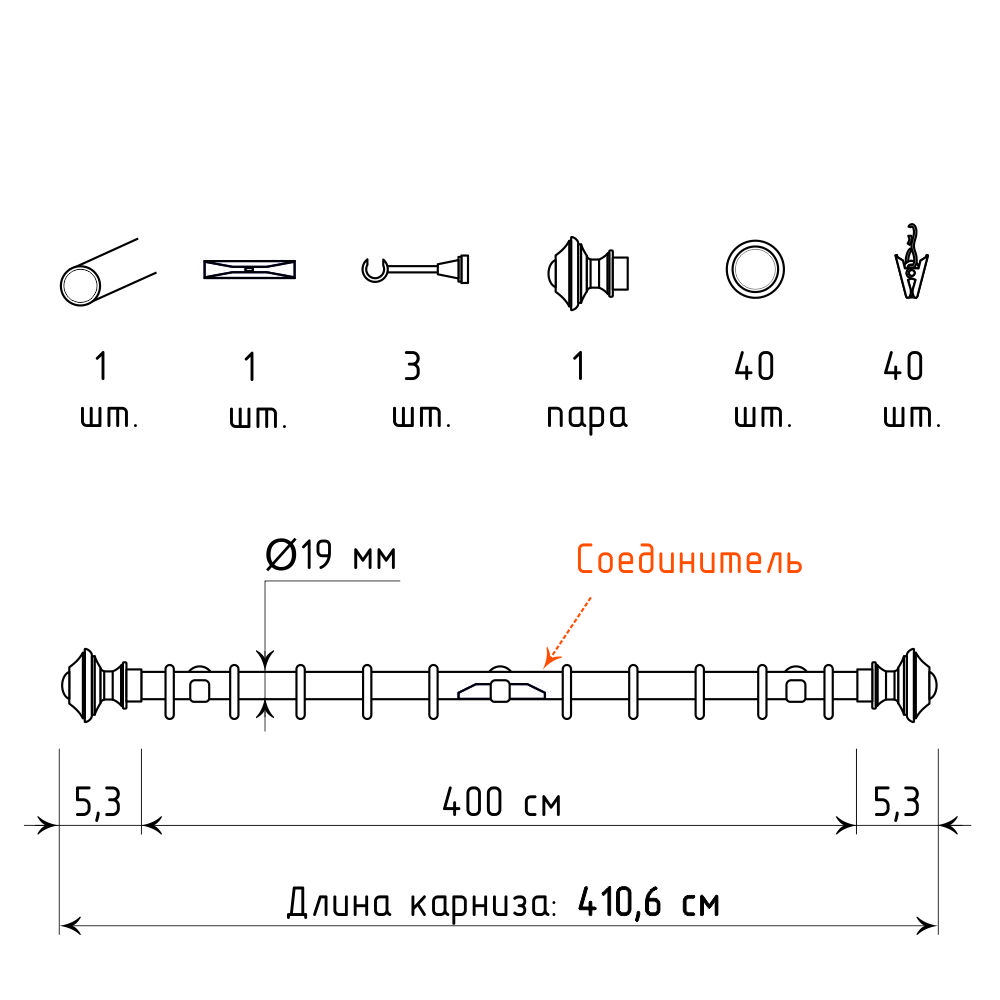 Длина карниза указана без учета размера наконечников. Следует учитывать, что длина наконечника «Верди» составляет 5,3 см с каждой стороны. По индивидуальному запросу можно отрегулировать длину карниза, достаточно оставить об этом комментарий и указать необходимый размер трубы.