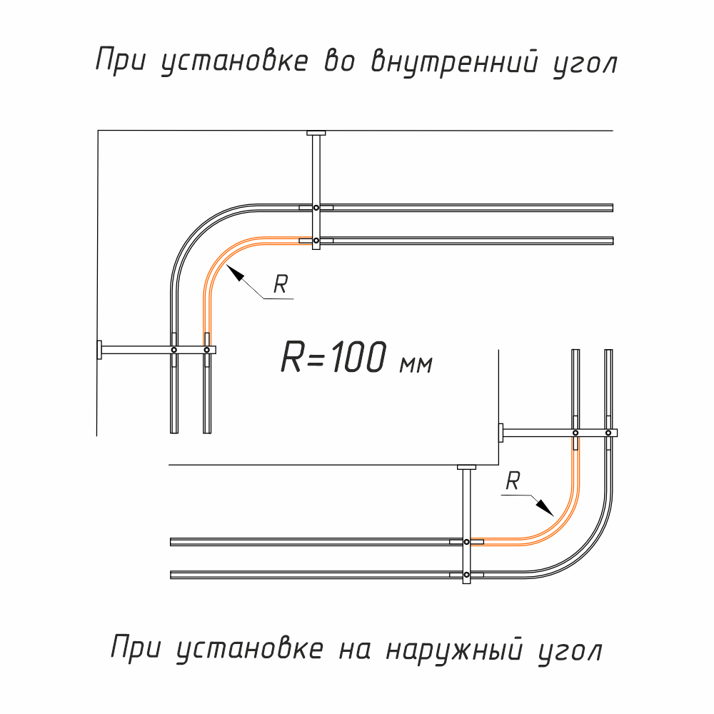 Поворотный элемент для алюминиевого профиля «Лайн» – это идеальное решение для угловой стыковки карниза под углом 90 градусов с радиусом поворота 100 мм. Он обеспечивает надежное соединение как для наружных, так и для внутренних углов, сохраняя безупречное соответствие цвету карниза. При установке снаружи угловое соединение размещается в первом ряду карниза, а при установке внутри — во втором ряду.