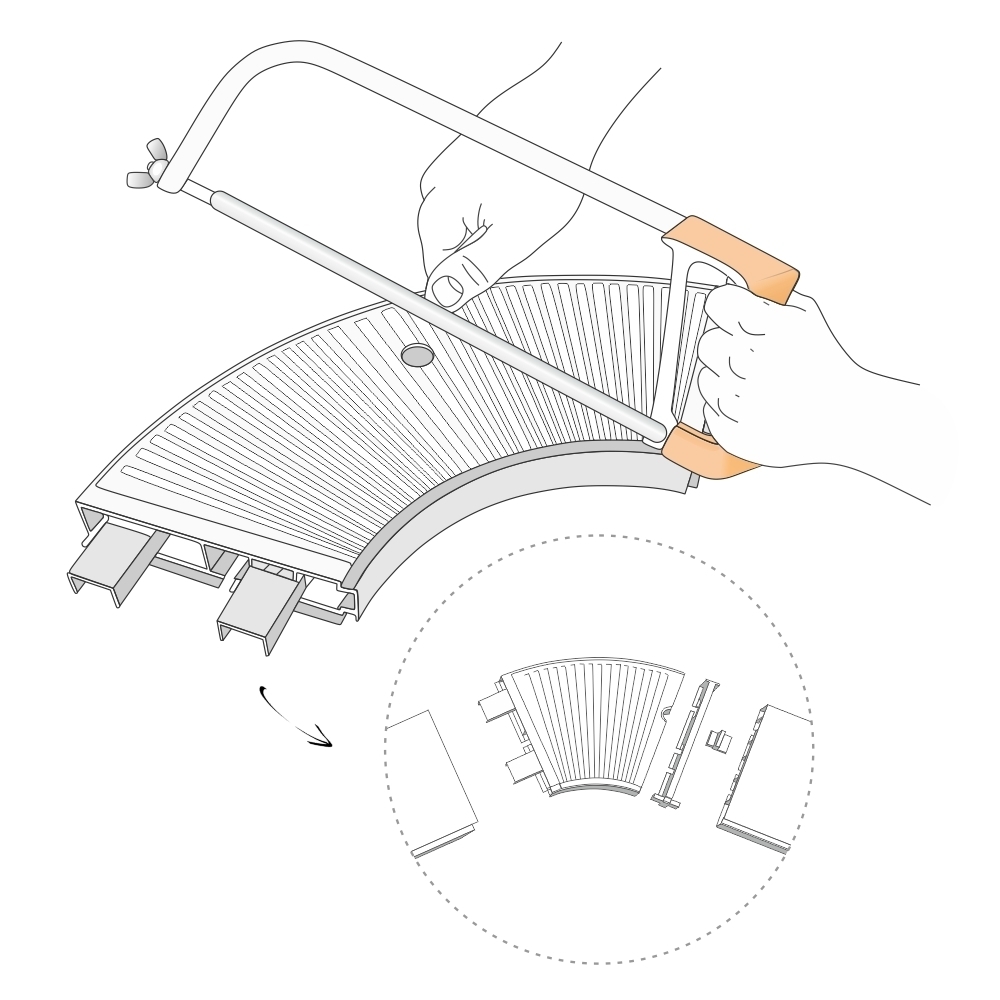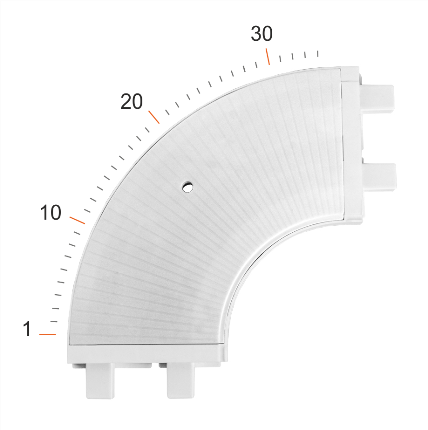 Исходя из размеров оконной ниши угол стандартного поворота можно менять – в этом его универсальная особенность. На пластиковом повороте есть специальные насечки (каждая по 2,5 градуса) для удобного распиливания обычной ножовкой. Отрезав боковую секцию от пластиковой дуги нужного размера край срезанного поворота соединяется с потолочной шиной специальным адаптером.