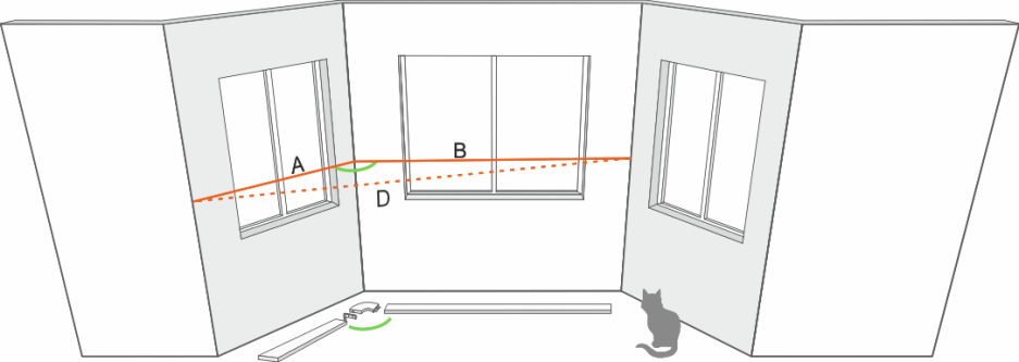 Монтаж карниза с поворотным элементом возможен только на потолок. Для надежной фиксации поворота шину необходимо фиксировать шурупами на расстоянии 5 см с двух сторон от поворотной дуги.