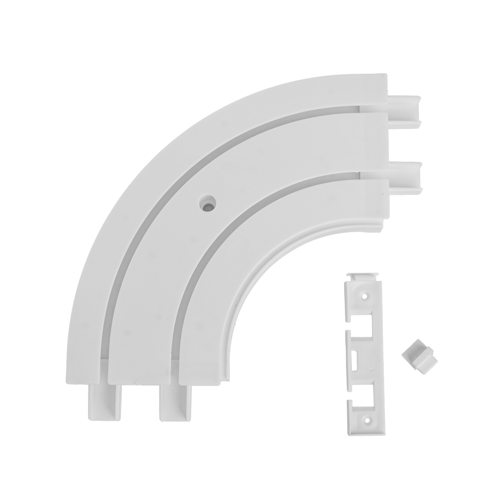 Пластиковый двухрядный поворот для потолочной пластиковой шины предназначен для эркерных окон.