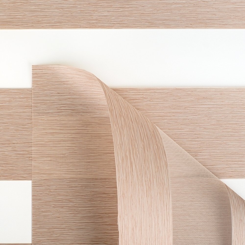 Готовые рулонные шторы на окна модели «Мини день-ночь» – это два тканных полотна с прозрачными и полупрозрачными полосами, которые чередуются с равным интервалом. При подъёме и опускании шторы полосы на ткани смещаются относительно друг друга, что приводит к изменению светопроницаемости.