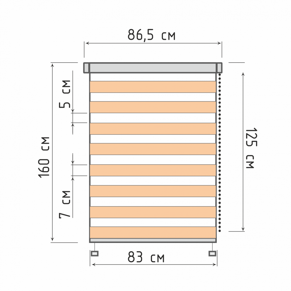 Указано соотношение ширины полос на полотне шторы. Нижнее значение – ширина плотной затемнённой полосы; верхнее значение – ширина прозрачной полосы.