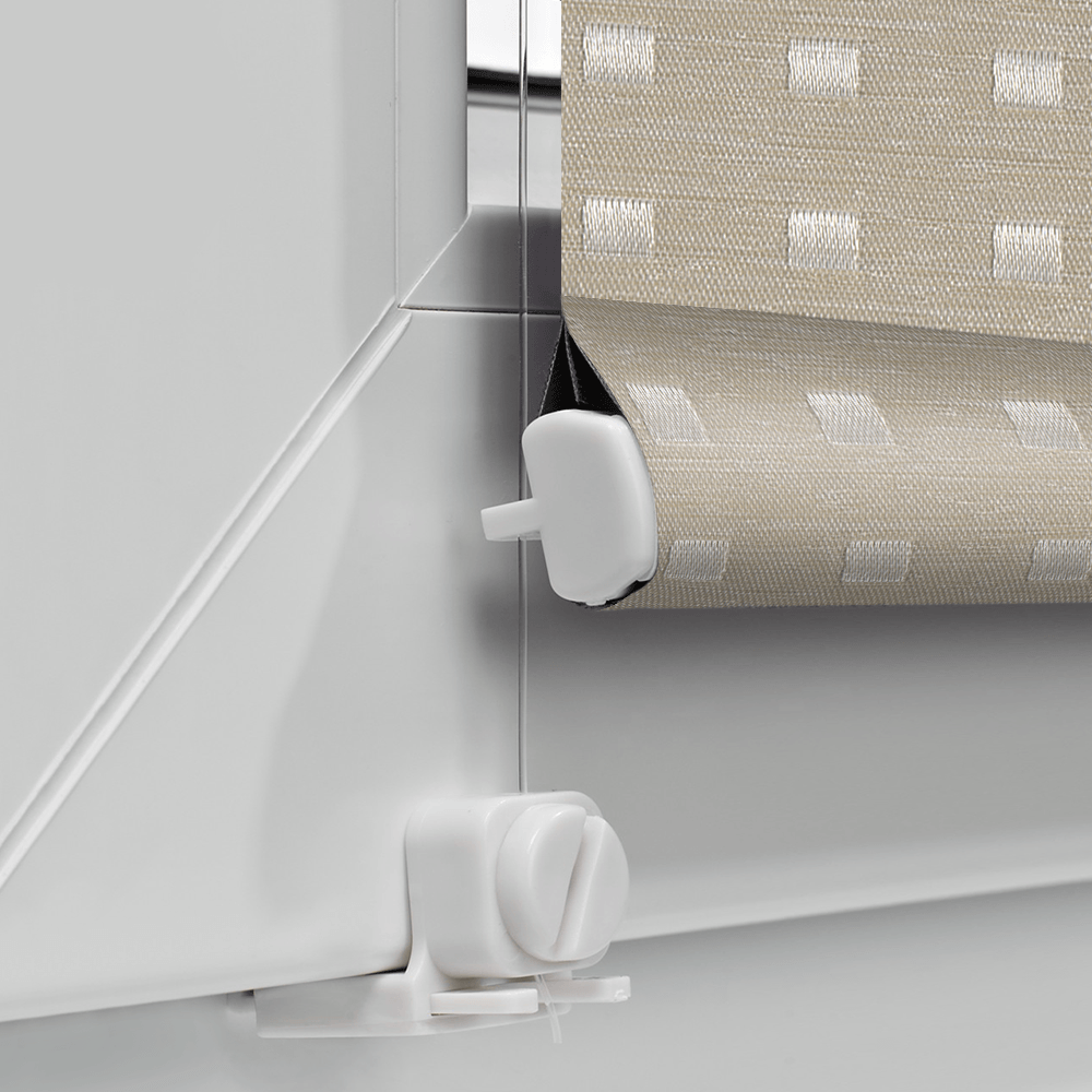 Монтаж без сверления позволяет надёжно прикрепить штору к окну, сохранив раму в целости, без отверстий под саморезы. Установка производится с помощью двустороннего скотча (к глухой створке) и специальных кронштейнов (на откидную створку).