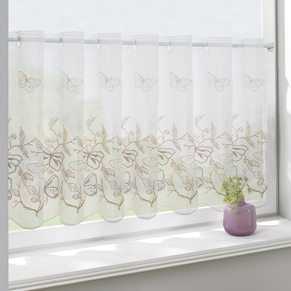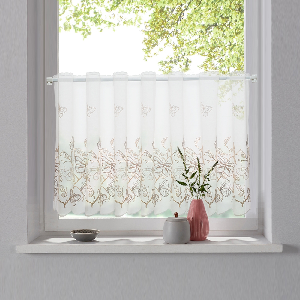 Мини-шторки, размещаемые на мини-карнизе и прикрывающие лишь часть окна, выполнены из качественной шелковой ткани производства Турции. На белом легком и воздушном полотне разместились невесомые бабочки. Это набивная вышивка в бежево-серых пастельных тонах.