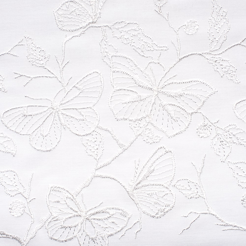 Насыщенно белый цвет ткани украшает набивная вышивка молочного оттенка. Узор из веточек с листиками и порхающими бабочками.