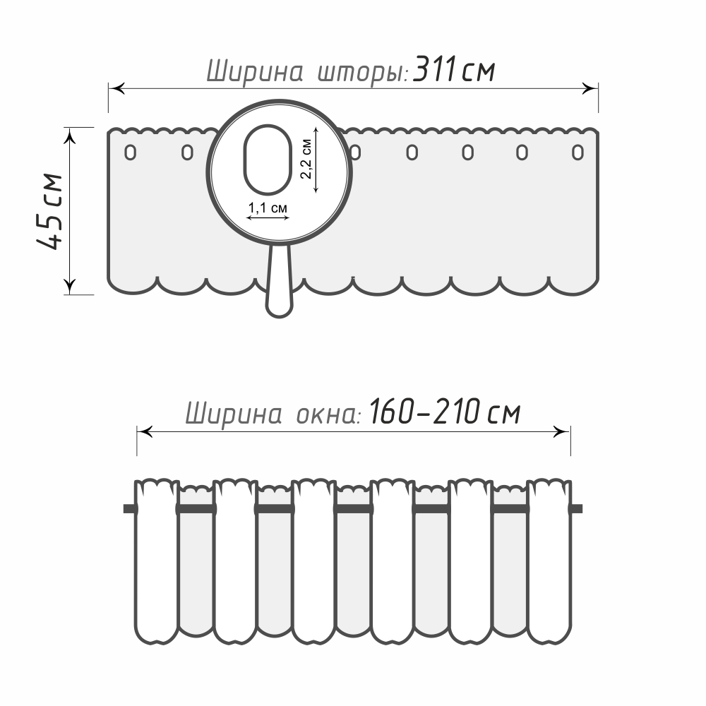 Верхний и нижний край шторы обрамлен каймой, как и люверсные петли, которые служат для размещения шторки на мини-карнизе.