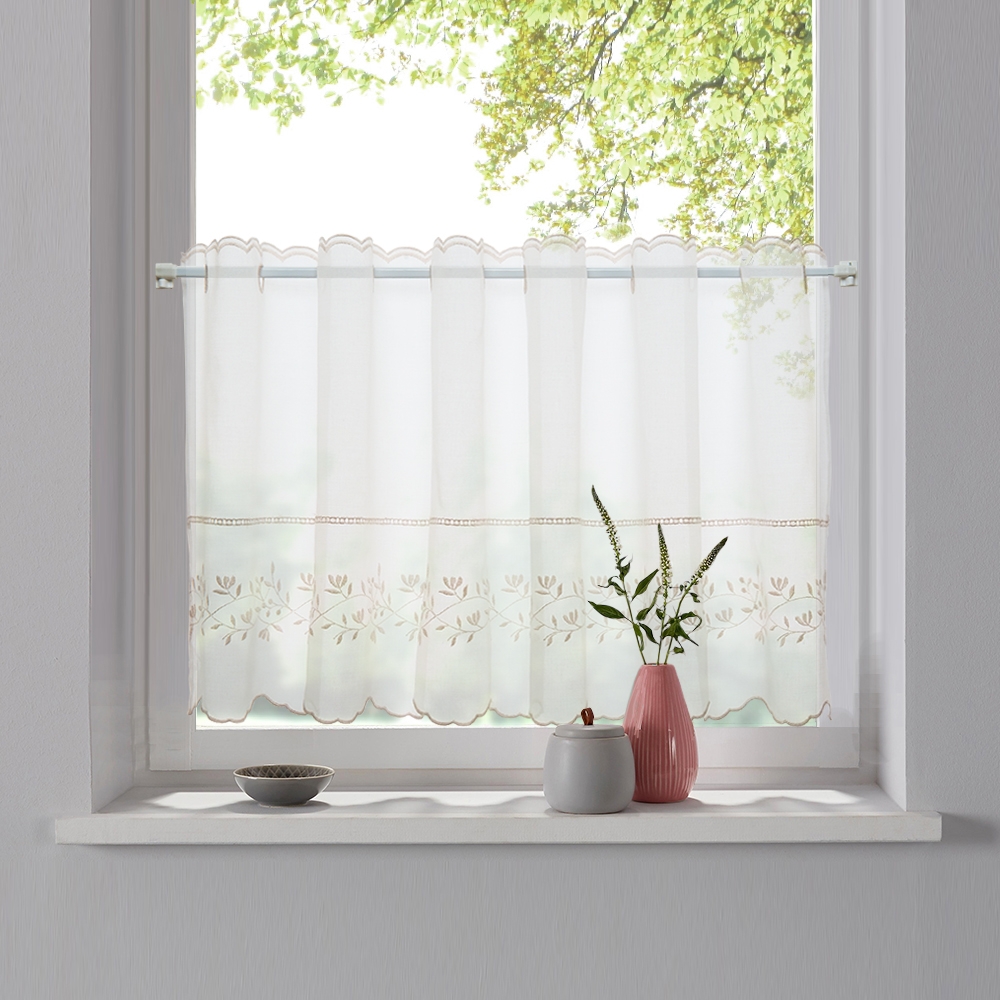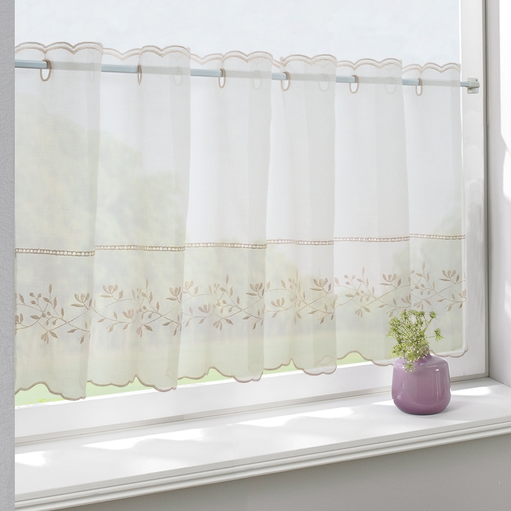 Белая, легкая и прозрачная турецкая ткань. Набивная вышивка ручной работы в виде переплетенных ветвей в нежных, бежевых тонах. Прорезные люверсные петли для размещения на карнизе. Все это о шторах-кафе, которые станут прекрасным дополнением вашего интерьера.