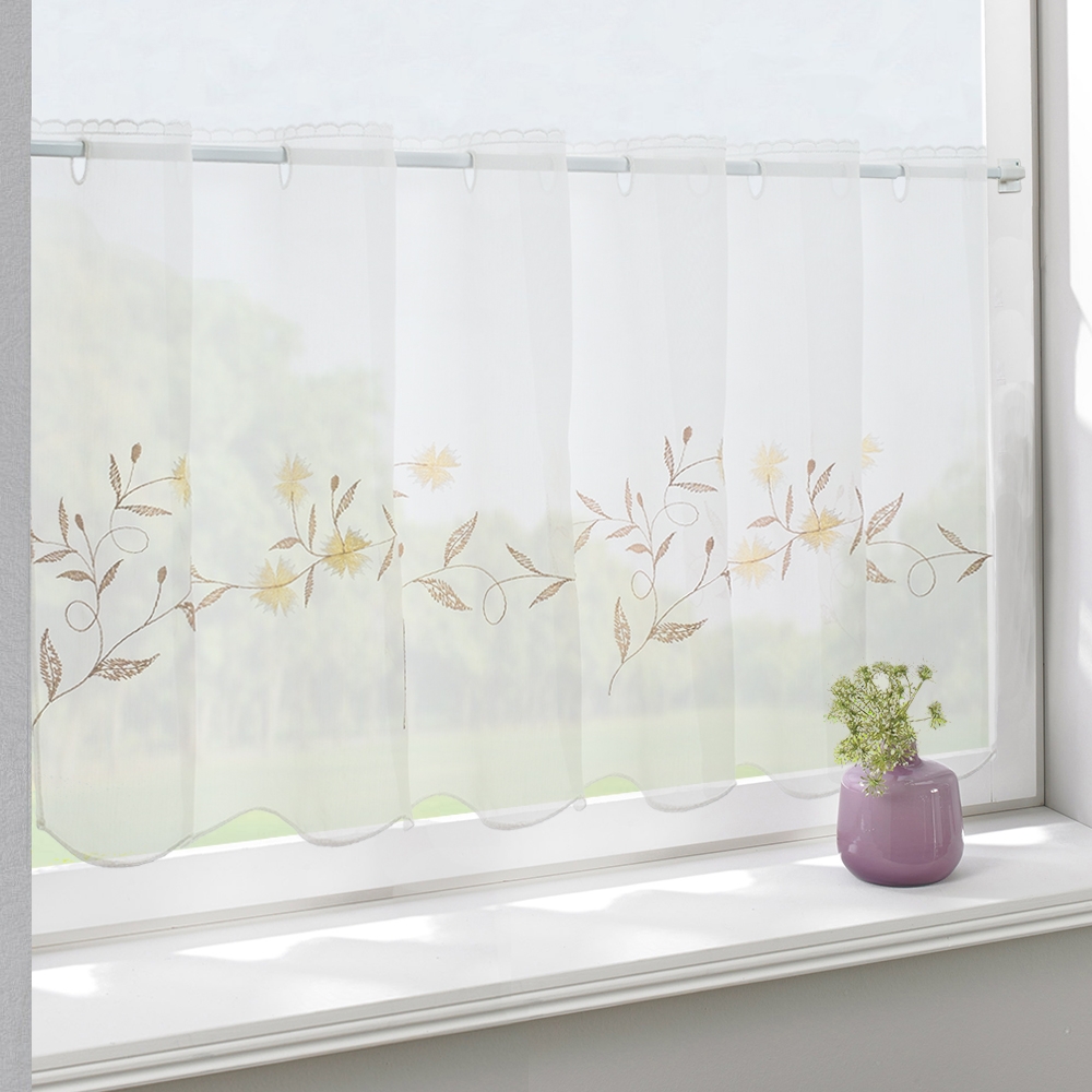 Шторы-кафе выполнены из качественной турецкой ткани, напоминающей шелк. На прозрачном полотне размещена набивная вышивка ручной работы в виде летних полевых цветов васильков в нежнейших пастельных оттенках: стебли и листья вышитой композиции бежевые с желтыми васильками.
