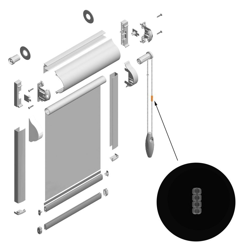 Соединитель предназначен для фиксации крайних сегментов пластиковой цепи управления. При этом создаётся цепочная петля, которая проходит через механизм управления и дает возможность поднимать и опускать полотно рулонных штор.