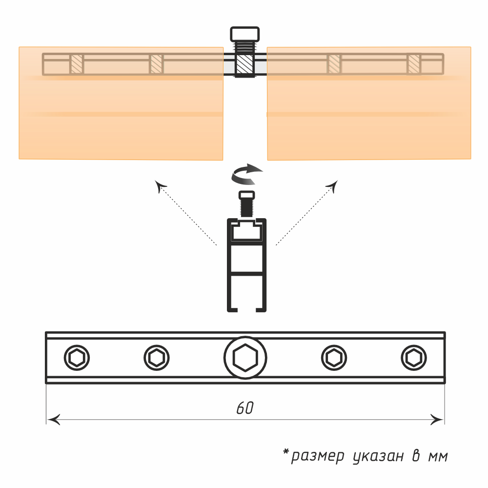 Вставьте соединитель до середины в верхний паз первого профиля (нижний паз предназначен для шторных бегунков)