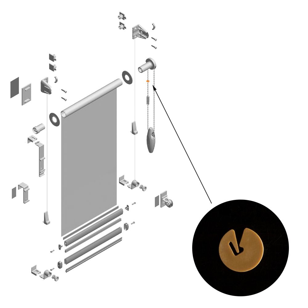 Установленное на цепочку, стопорное кольцо не позволяет ей свободно прокручиваться в поворотном механизме, фиксируя необходимое положение шторного полотна.