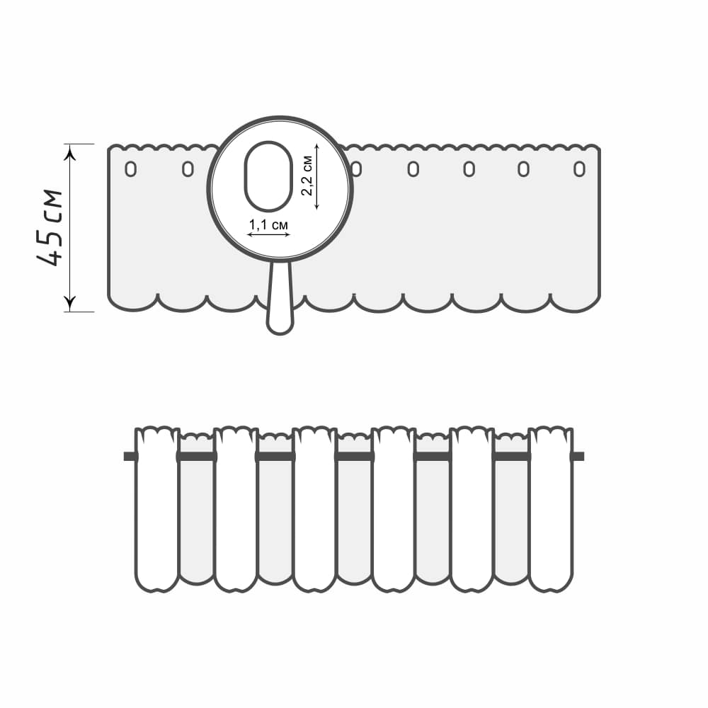 Люверсные петли, предназначенные для крепления на мини-карнизе, а также верхний и нижний край ткани обрамлены белой незаметной каймой. Высокое качество ткани, а также небольшой размер мини-штор, которые прикроют лишь часть окна, пропуская дневной свет в комнату, станут прекрасным дополнением интерьера.