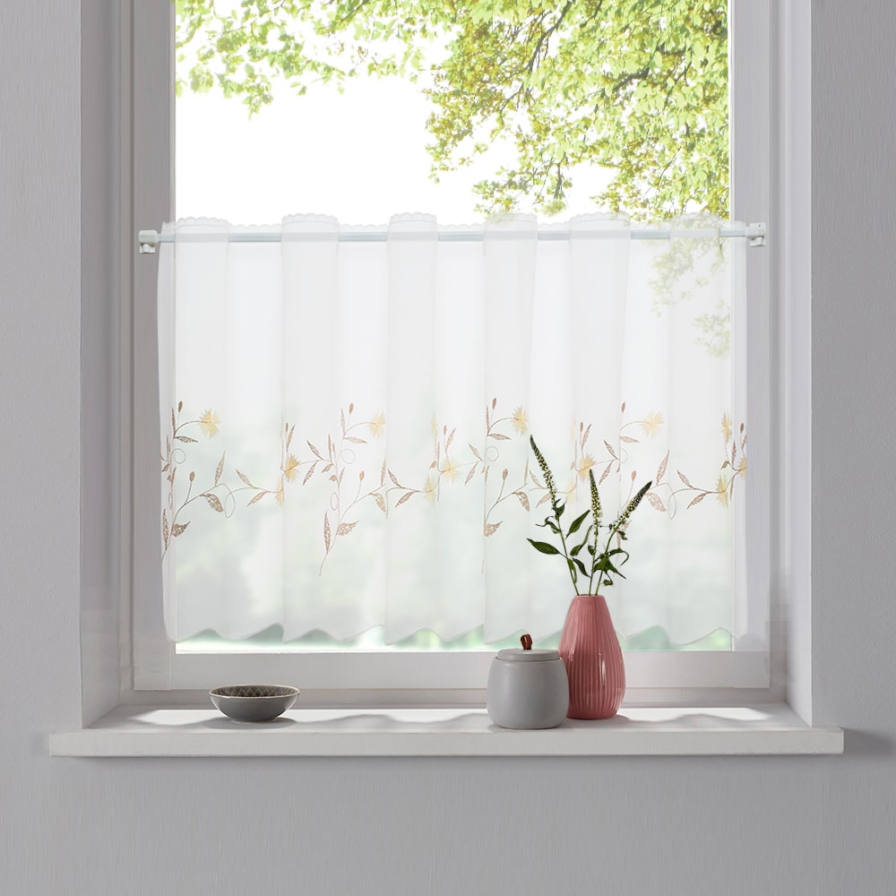 Ткань для штор-кафе коллекции «Romantik» – это нежная композиция в виде летних полевых цветов васильков на легкой и прозрачной белой ткани. Набивная вышивка ручной работы выполнена в нежнейших пастельных оттенках: стебли и листья васильков бежевые с желтыми васильками.