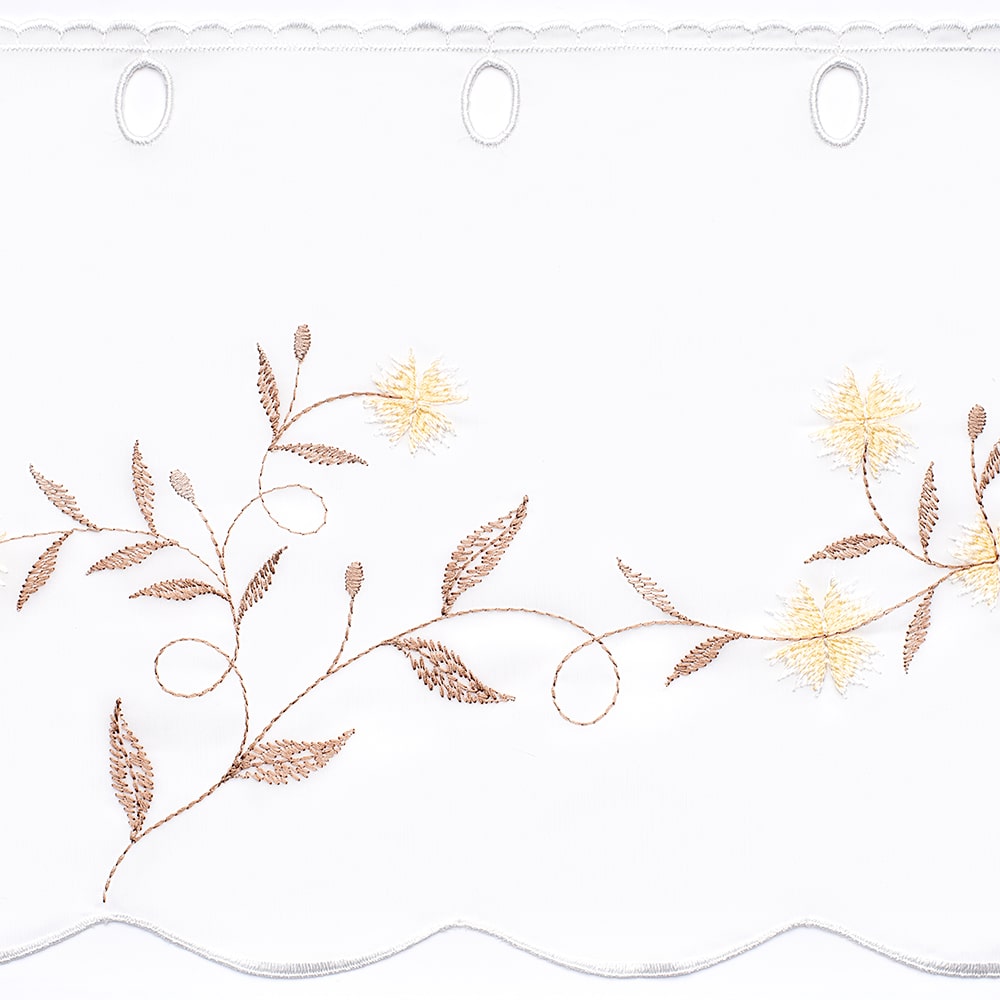 Ткань для штор-кафе коллекции «Romantik» – это нежная композиция в виде летних полевых цветов васильков на легкой и прозрачной белой ткани. Набивная вышивка ручной работы выполнена в нежнейших пастельных оттенках: стебли и листья васильков бежевые с желтыми васильками.