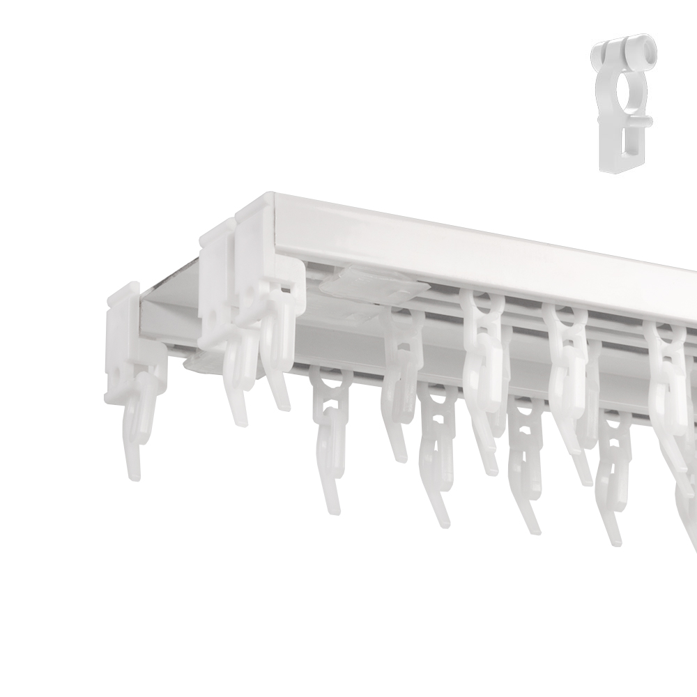 Конструкция предусматривает наличие специальных дорожек, по которой плавно, без усилий перемещаются бегунки со шторными французскими крючками.