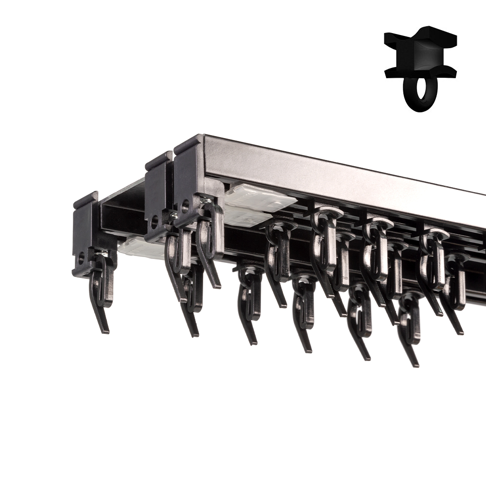 Конструкция предусматривает наличие специальных дорожек, по которой плавно, без усилий перемещаются бегунки со шторными французскими крючками.