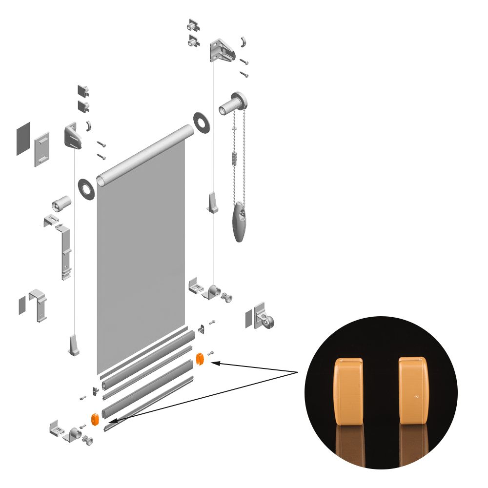 Заглушки для нижнего отвеса – детали, которые обеспечивают общий привлекательный вид рулонной шторы. Они крепятся на обе кромки отвеса и придают всей системе рулонной шторы готовый вид.