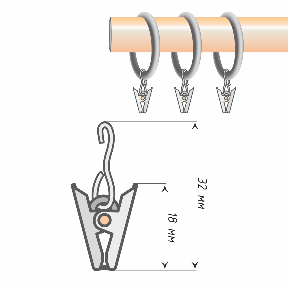 Крючок шторного зажима крепится на кольцо или бегунок, а в подвижной зажимной части аккуратно фиксируется полотно занавески.